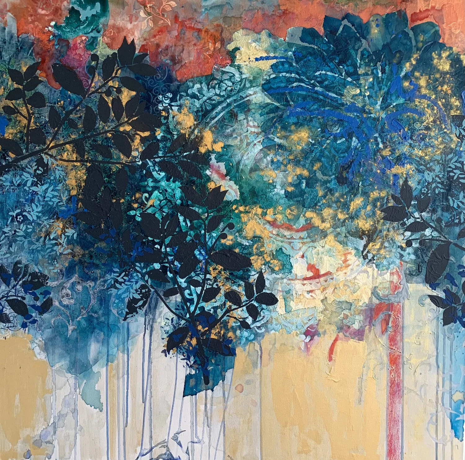 “Raja II”  30”x30”, acrylic, chalk paint, pastel on canvas  © 2021 Kathryn Neale Studio. All Rights Reserved.